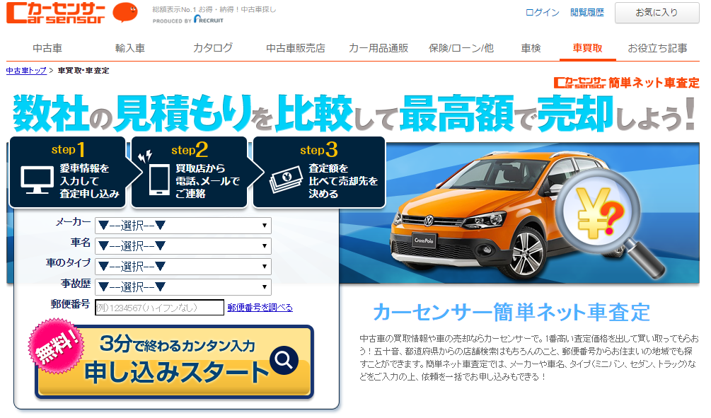 高値で買取してくれる業者を簡単に探す方法がカーセンサー簡単ネット査定です。